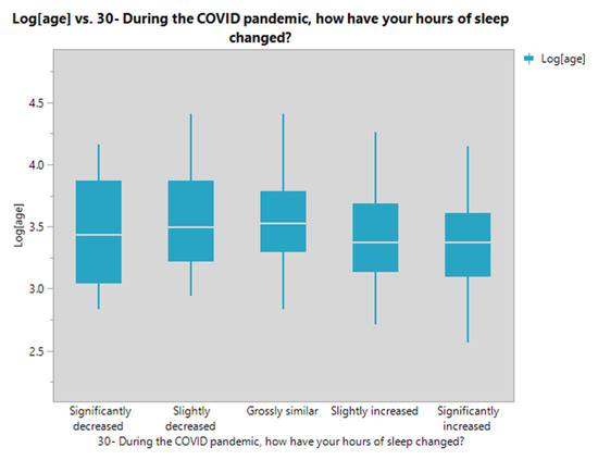 The association between sleep patterns and age has been studied. The respondents who increased their sleeping hours tended to have a younger mean of age for all significant pairwise comparisons. However, the age data did not follow the normality assumptions, so the data were transformed using the Log transform before the analyses. For more information about Log transform, see [34].