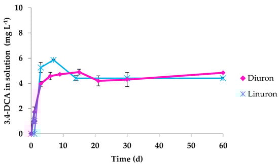 In this work, 3,4-DCA was the only metabolite quantifiable in the solution formed from diuron and linuron biodegradation after inoculation with the investigated phenylurea degrading strain. For chlorotoluron, fluometuron and isoproturon typical aniline metabolites (3-chloro-4-methylaniline, m-trifluoromethylaniline, isopropylaniline, respectively) were not detectable at the end of the biodegradation assay. Also, Tixier et al. [17] observed that the aniline metabolites from chlorotoluron and isoproturon were produced at a low concentration that they could not be also detected, whereas formation of 3,4-DCA from diuron was almost quantitative. 3,4-DCA can be produced during biotic and abiotic degradation processes of diuron and linuron, and shows a higher ecotoxicological impact on living organisms than the parent compounds and hence the importance of studying its possible formation. Huda Bhuiyan et al. [47] stated that 3,4-DCA can be considered as one of the major aniline derivatives released into the environment, capable of provoking disruption of the endocrine and other biological systems in animals. Figure 2 shows the concentration of 3,4-DCA produced throughout the biodegradation of diuron and linuron in solution when O. anthopi CD3 was inoculated. The highest 3,4-DCA concentration was observed within 9 and 15 d of incubation in the case of diuron (4.7-4.9 mg L−1), and in the case of linuron, the highest concentration (5.9 mg L−1) was reached after 7 d of assay. 3,4-DCA concentration was maintained without any further degradation until the end of the experiment (60 d). In both cases a similar metabolite formation profile was observed.