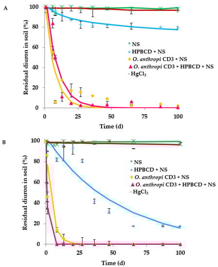This latter option was tested by using HPBCD. In the case of R soil, diuron biodegradation curve obtained in the presence of NS and HPBCD indicated a slight enhancement in comparison with the biodegradation profile obtained when only biostimulation with NS was applied (Figure 3A). DT50 decreased from more than 10,000 d until about 1000 d, and 20.3% of diuron biodegraded was reached after 100 d of experiment (Table 3). In the case of PLD soil, better results were observed, where the addition of HPBCD provoked a great increase in diuron biodegradation, decreasing DT50 from almost 9000 d to about 37 d, and reaching an extent of biodegradation of 84%. These results might be due to the low OM content in PLD soil (1.67%) in comparison with the R soil (3.44%). Diuron has a high affinity for soil OM, causing a reduction of its bioavailability as higher is the percentage of OM in soil [48,49,50].