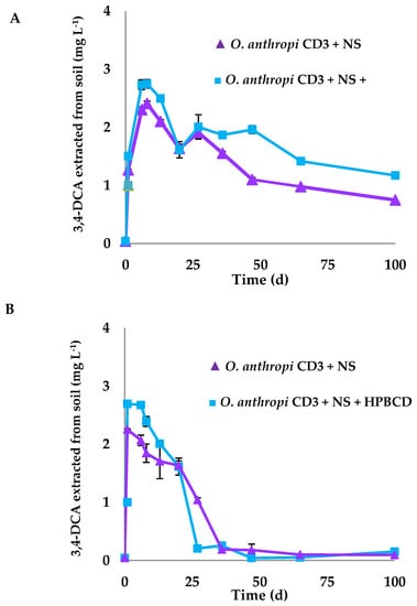 The main metabolite of diuron, 3,4-DCA, was monitored throughout the soil biodegradation assays when using O. anthropi in both soils (Figure 5 and Figure S2). Its maximum concentration in PLD soil was observed after 24 h of the assay (Figure 5B), reaching a higher value in the presence of HPBCD, and being completely degraded after 50 d. R soil has a higher soil OM content than PLD soil, which provoked a lower bioavailability of both, the herbicide and 3,4-DCA [58], and for this reason, the maximum concentration of 3,4-DCA was reached after 8 d, and its dissipation rate in this soil was much slower than in PLD soil, being not possible to achieve its complete biodegradation after 100 d of incubation (Figure 5).