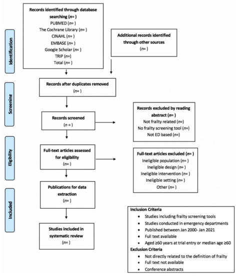 Further, given the importance of, and challenges associated with, identifying frailty in EDs, the systematic review and meta-analysis described in this study protocol aims to: (1) review the evidence regarding the diagnostic accuracy to identify frailty and subsequent risk of adverse outcomes, and (2) to evaluate the clinimetric properties of current frailty screening tools and brief frailty-oriented risk-stratification instruments used in EDs for older people.