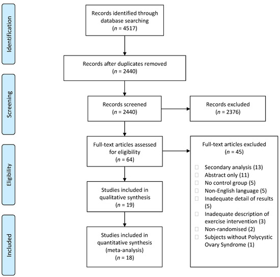 After removing duplicates, two researchers (A.B. and A.S.) independently screened the search results against the eligibility criteria, and records which could not be eliminated by title or abstract were retrieved and reviewed in full. Disagreements regarding eligibility were resolved by a third researcher (N.A.J.). Attempts were made to contact the authors for additional information where needed. In instances where the authors were unresponsive, the studies were eliminated. Data regarding participant characteristics (age, BMI, and PCOS diagnostic criteria), exercise interventions (mode, frequency, intensity, session duration, intervention duration), additional interventions (dietary and/or pharmacological prescriptions), and pre- and post-intervention measures of cardiorespiratory fitness, waist circumference, systolic blood pressure, HOMA-IR, fasting blood glucose, triglycerides, and/or HDL-C were extracted. Aerobic exercise interventions could be further subcategorised into either MICT or HIIT according to classifications and guidelines published elsewhere [10,15]. All data were independently extracted by two researchers (A.B. and A.S.). Discrepancies were resolved via synchronous review of data presented in the original publications.