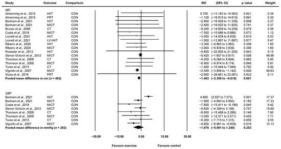 Effect of exercise vs. control for change in waist circumference and systolic blood pressure. CI: confidence interval, CT: concurrent training, HIIT: high-intensity interval training, LV-HIIT: low-volume high-intensity interval training, MD: mean difference, MICT: moderate-intensity continuous training, PRT: progressive resistance training, SBP: systolic blood pressure, WC: waist circumference.