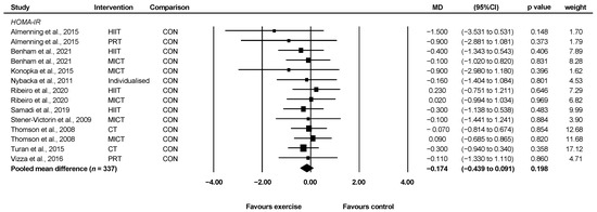 Effect of exercise vs. control for change in HOMA-IR. CI: confidence interval, CT: concurrent training, HIIT: high-intensity interval training, MICT: moderate-intensity continuous training, MD: mean difference, PRT: progressive resistance training.