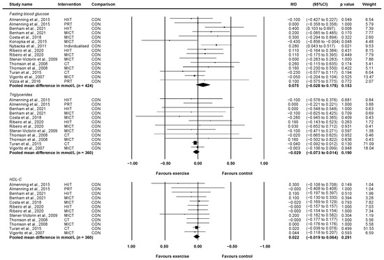 Effect of exercise vs. control for change in fasting blood glucose, HDL-C, and triglycerides. CI: confidence interval, CT: concurrent training, HDL-C: high-density lipoprotein cholesterol, HIIT: high-intensity interval training, MD: mean difference, MICT: moderate-intensity continuous training, PRT: progressive resistance training.