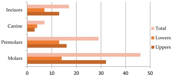 Of the total sample, 74% (n = 99) of the subjects had undergone at least one previous root canal treatment. Forty-six percent of treated teeth were molars; 29 percent were premolars, 7 percent were canines, and 17 were incisors (Figure 2). 31 percent were diagnosed with needed retreatment and 68 percent were primary endodontic treatment.