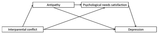 Full proposed model for the mediating roles of maternal antipathy and psychological needs satisfaction in the association between interparental conflict and depression.