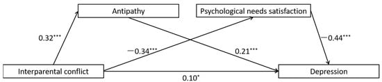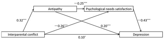 Results of the full proposed model for the mediating roles of antipathy and psychological needs satisfaction in the association between interparental conflict and depression. Note: significant standardized paths are displayed by the solid lines. *** p < 0.001, * p < 0.05.