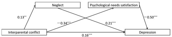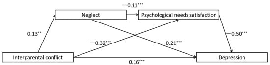 Results of the full proposed model for the mediating roles of neglect and psychological needs satisfaction in the association between interparental conflict and depression. Note: significant standardized paths are displayed by the solid lines. *** p < 0.001, ** p < 0.01.