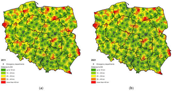 The emergency medical services support the primary health care system. Hospital emergency departments (HEDs), which provide medical assistance to all patients in a state of emergency are of considerable importance to the system. When studying access to HEDs, attention should be focused on spatial relations resulting from the location of HEDs and the places of residence of the potential patients. The aim of the paper is to explain the level of spatial accessibility of HEDs and its changes as a result of organizational and spatial transformations of HEDs’ networks in Poland. The research was conducted within two time series, comparing the changes in the distribution of HEDs in 2011 and 2021. GIS techniques were used to measure the distances between emergency departments and places of residence. It was observed that the transformation of the spatial organization of the hospital emergency department network in 2011–2021 resulted in the overall improvement of the spatial accessibility of these facilities, reducing the distance between them and places of residence.