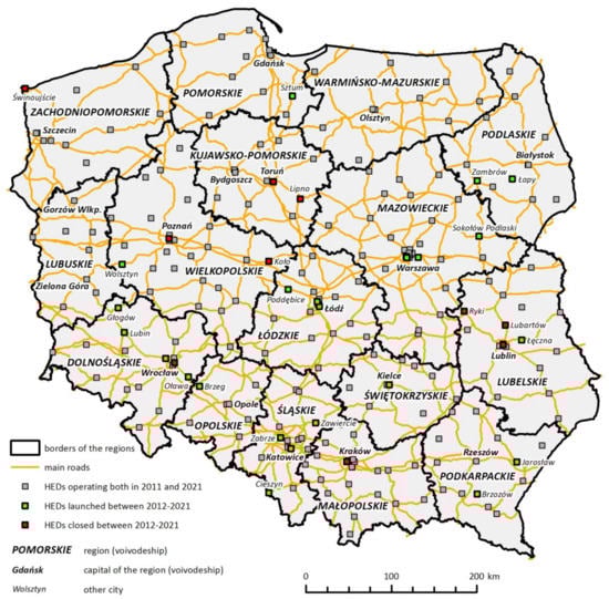 The analysis of the spatial accessibility of HEDs in Poland proved that a decreasing share of the population lives in further zones of remoteness. There are exceptions to this rule in two regions—Warmińsko-Mazurskie and Zachodniopomorskie. In these regions, the network of HEDs is not fully adjusted to the population distribution. In Warmińsko-Mazurskie, the situation will be improved by launching the planned HED in Szczytno. It seems that an additional location in Ostróda and Braniewo would be worth considering. In the Zachodniopomorskie region decision makers should consider locating new HEDs in Świnoujście, Kołobrzeg and Myślibórz (locations not included in the plan).