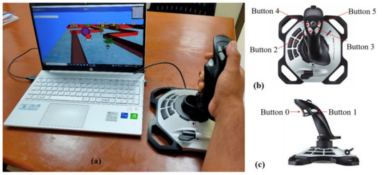 (a) VR setup with joystick and the subject performing the tasks, (b) top view of the joystick, and (c) side view of the joystick.