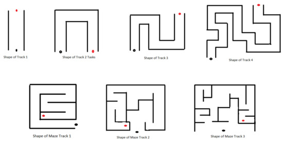 Figure 3. Representative shapes of various tracks used in designing VR tasks; black dot: starting position of the car; red dot: target position of the duck.