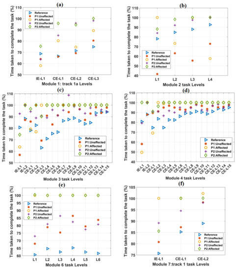 The variations in TCT values with task difficulty levels in other tracks are shown in Figure 4. The mean TCT values for healthy subjects were computed and taken as a reference. As task difficulty increased, TCT values were observed to be increasing, except task levels in module 6 (Figure 4e). For module 6 task levels, TCT values were found to be almost equal. For all the IE and CE task levels, the reference TCT values were found to be less than 100%. In most of the task levels, TCT values were found to be 100% for the affected hands of both the patients. TCT values obtained from the unaffected hands of both the patients were found to be numerically closer to the reference values (Supplementary Figure S1). Without any time-limit, TCT values exceeded the maximum value of 100% (Supplementary Figure S1).