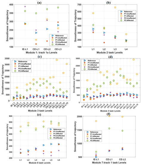 The variation of the Trajectory smoothness parameter with an increase in difficulty levels in (a) Module 1, (b) Module 2, (c) Module 3, (d) Module 4, (e) Module 6, and (f) Module 7 tasks. In each case, the scores of both the patients were plotted against the mean score of forty healthy subjects, which was taken as a reference. In most of the cases, trajectory smoothness values obtained from the affected hands of both the patients were relatively greater than these reference values.