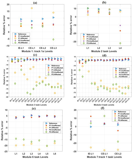 The variation of the relative % error parameter with the increase in difficulty levels in (a) Module 1, (b) Module 2, (c) Module 3, (d) Module 4, (e) Module 6, and (f) Module 7 tasks. In each case, the scores of both the patients were plotted against the mean score of forty healthy subjects, which is taken as a reference. In most of the cases, relative % error values obtained from the affected hands of both the patients were relatively less than these reference values.