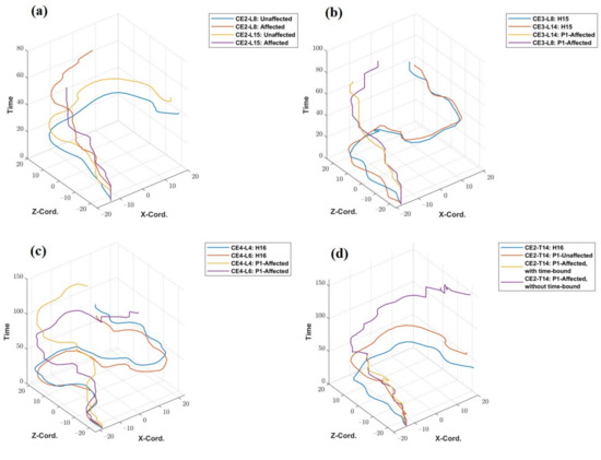 The trajectory plots of the unaffected and affected hands of patient P1 for tasks CE2- L8 and L15 are shown in Figure 7a. The x- and y-axis of the trajectory plots represent the recorded X and Z—coordinates of the traveled path. The Y coordinate values remain fixed throughout the trajectory (In the default coordinate system of the Vizard software environment, the Y coordinate value represents height.). The z-axis of the plot represents the sampling time of the X and Z coordinates of the trajectory. The patient P1 took 42.27 s to complete CE2-L8 with his unaffected hand but failed to reach the target point even after utilizing the full 45 s of the specified time limit. Hence, the line showing the trajectory of the patient’s unaffected hand is incomplete and has a higher value in the time axis. Similarly, for CE3 (L8 and L14) and CE4 (L4 and L6), the trajectories of healthy subjects and that of the patient’s affected hand are plotted and shown in Figure 7b,c. Figure 7d shows the comparison of the trajectory of a healthy subject, the unaffected hand of the patient, and the affected hand of the patient (with and without specified time constraints). The patient could not complete the task using his affected hand within the time limit of 45 s, but when asked to perform without any time-bound, it took 236.23 s to reach the target. A plot showing trajectories of four representative healthy subjects (H5, H11, H14 and H20) and two stroke patients for the task-level CE3-L11 is given in Supplementary Figure S7.