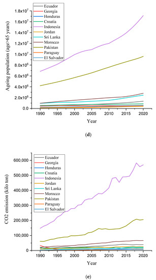 This work attempts to probe the impact of ageing people on CO2 emissions by controlling the other socio-economic factors of globalization, natural resources, GDP, and energy use. In doing so, this work utilizes the annual data of 1990–2020 for G-11 nations of Croatia, Jordan, Ecuador, El Salvador, Georgia, Honduras, Morocco, Indonesia, Paraguay, Pakistan, and Sri Lanka. The data for GDP per capita (constant terms), CO2 emissions (kilo tons), natural resources (% of GDP), energy use (kg of oil equivalent per capita), research, and development (number of patents), and the ageing population 65 and above were used. All the data were obtained from the World Bank [39] except the data for globalization, which was obtained from the KOF Economic Institute [40]. Figure 1a–e illustrates an increasing trend in globalization, GDP per capita, natural resource abundance, research and development, ageing population, and CO2 emissions in G-11 countries. Croatia showed the highest globalization during 1990 to 2020. Similarly, Indonesia had the highest economic growth among the G-11 countries during the study period. The highest natural resource was in Ecuador. Indonesia had the highest number of ageing people during the study period.