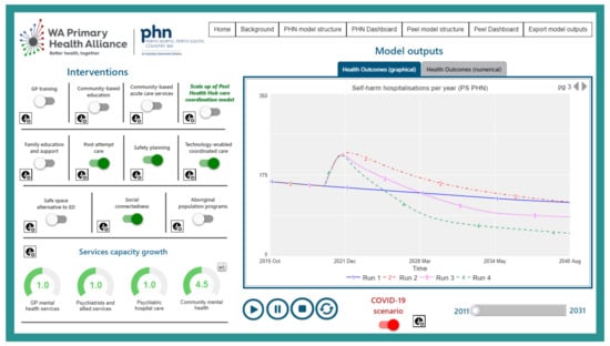 This analysis was undertaken using an existing regional system dynamics model developed in August 2020 for the Perth South Primary Health Network (PHN) population catchment. Perth South PHN is a metropolitan region of Western Australia, covering 5069 square kilometres with an estimated resident population of 973,769 [,]. The system dynamics model developed was based on a similar model reported elsewhere [] that was reviewed, re-parameterised, and verified in partnership with Perth South PHN collaborators to ensure that the model structure and assumptions were valid for the Perth South context. Briefly, the model includes: (1) a population component, capturing changes over time in population size resulting from births, migration, and mortality; (2) a psychological distress component that models flows of people to and from states of low or no psychological distress (Kessler 10 [K10 scores below 15), and moderate to very high psychological distress (K10 score 16−50); (3) a mental health services component that models the movement of psychologically distressed people through possible service pathways across the primary to tertiary service continuum involving (potentially) general practitioners (GPs), psychiatrists and allied mental health professionals (including psychologists, mental health nurses, social workers, etc.), psychiatric inpatient care, community mental health centres, and online services; (4) a suicidal behaviour component that captures self-harm hospitalisations and suicide deaths; and (5) a COVID-19 component that captures the impact of the pandemic and recession on social connectedness, unemployment, and psychological distress from 1 March 2020. The primary model output used for this analysis was the total (cumulative) numbers of suicide deaths. Figure 1 presents a high-level map of the system dynamics model showing the (causal) interconnections between the components and Figure 2 presents the interactive user interface of the model.