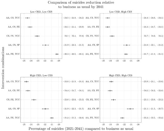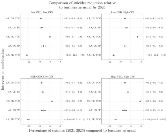 Figure 4 shows time series graphs of the best performing combinations across the four COVID-19 mental health scenarios (A–D), demonstrating their non-linear impacts over time. Results of the analysis of best performing interventions for different time horizons are presented in Figure 3 (with a 2041-time horizon) and Figure 5 (with a 2026-time horizon). These results demonstrate that for each COVID-19 mental health trajectory, the ranking of best performing intervention combinations changes depending on the time horizon under consideration. For example, the best performing combination of interventions for the 2041-time horizon under the most conservative COVID-19 mental health scenario (i.e., Scenario A) includes post-suicide attempt aftercare, community support programs to increase community connectedness, and technology enabled care coordination, delivering a 24.5% (95% interval, 24.2–24.8%) reduction in suicide deaths against the baseline. However, the best performing combination of interventions for the 2026-time horizon under Scenario A includes post-suicide attempt aftercare, family education and support, and technology-enabled care coordination, delivering a 12.4% (95% interval, 12.2–12.5%) reduction in suicide deaths against the baseline. However, the rankings of best performing intervention combinations are largely consistent between COVID-19 scenarios (A–D) at any given horizon.