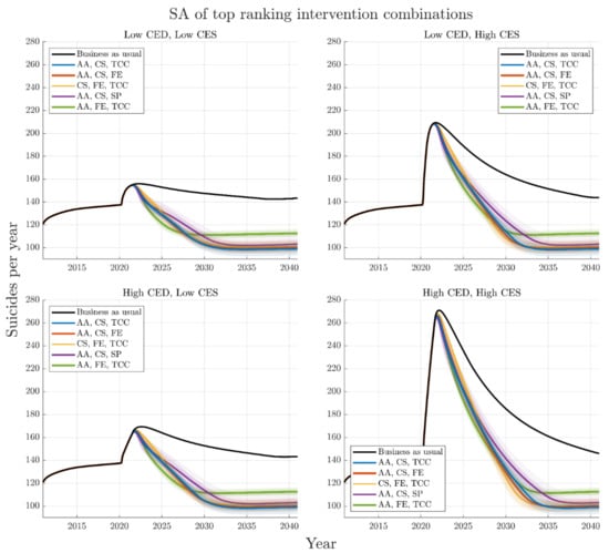 Trajectories for the best performing intervention combinations in reducing suicides deaths over the period 2021–2041 for the four different COVID-19 mental health scenarios: top left, short duration and low impact (Scenario A); top right, short duration and high impact (Scenario B); bottom left, long duration and low impact (Scenario C); bottom right; long duration and high impact (Scenario D). Default parameters are chosen for each intervention. The top three ranking sets of interventions are consistent across COVID-19 scenarios; however, the fourth top intervention combination differs depending on CES. The thick black curve indicates the business-as-usual case, the coloured curves indicate the top performing intervention combinations for reducing cumulative suicides from 2021–2041. Distribution means are indicated with a heavy line, and span of individual trajectories from the 100 runs of the sensitivity analysis are presented. AA is post-suicide attempt aftercare; CS is community support programs to increase community connectedness; SP is safety planning; FE is family education and support; TCC is technology-enabled care coordination.