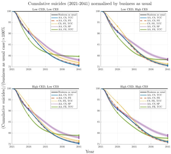 - Scenario A: short duration (CED = 0.5 years) and low impact (CES = 0.11)—lowest projected increase in suicides