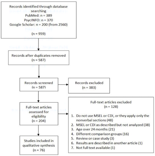 | Google Scholar | (risk OR likelihood) AND (sibling OR siblings) AND (ASD OR autism OR asperger OR “pervasive developmental”) AND (“Communicative Development Inventory” OR “Mullen Scales of Early Learning”) AND (month OR months) |