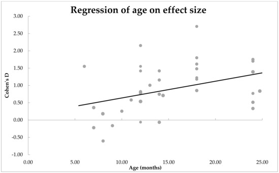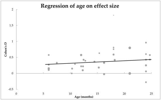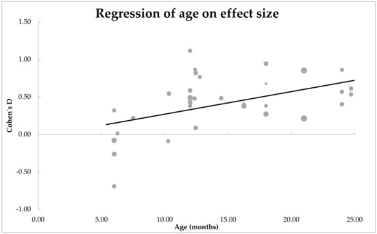 4.2. Does Age Moderate the Effect Size, or the Mean Difference, of the Expressive and Receptive Vocabulary Size of the Infant Groups?