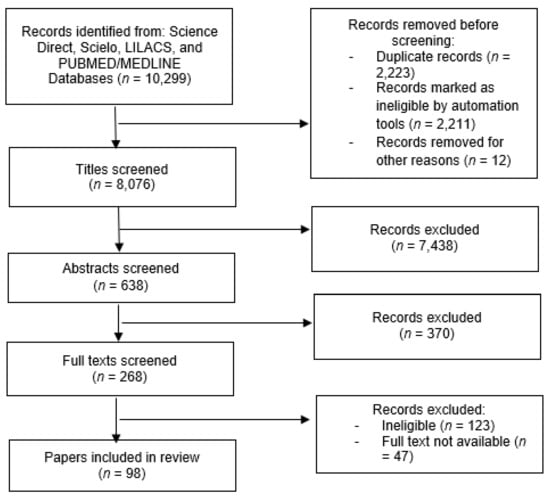 Overall, 8076 articles were identified (433 Science Direct, 684 Scielo, 2444 LILACS, and 4515 PUBMED/MEDLINE), of which 638 abstracts were screened, 221 full texts reviewed, and 98 articles selected for inclusion (5 PUBMED/MEDLINE articles, 27 Scielo articles, and 66 LILACS articles) (Figure 1).