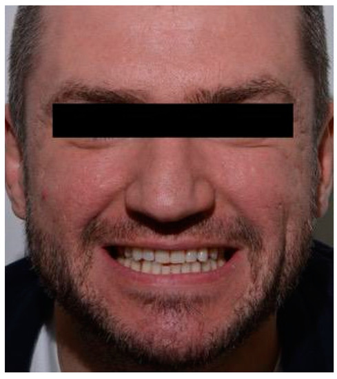 Due to the simplicity of the initial clinical situation, the patient was given the entire set of clear aligners, and he consistently changed them independently, appearing only one time in the middle of treatment for a control examination. At the end of orthodontic treatment, based on the previously planned LJ position and design of artificial teeth, a mock-up model was printed, and teeth shape was transferred to the oral cavity through a silicone paste, creating temporary restorations (Figure 10).