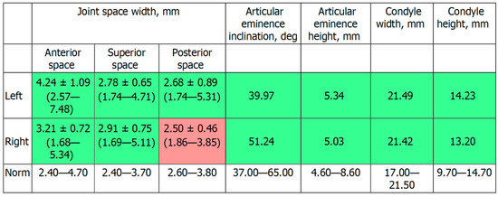 Table showed by the software. Intra-articular TMJ space widths before treatment. As represented in red, the posterior space width appears reduced with respect to normal values on the right TMJ.