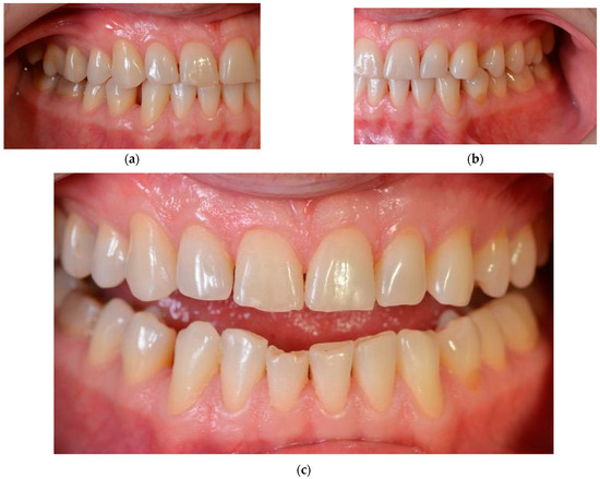 Intra-oral frontal and lateral views before treatment: (a) right lateral view; (b) left lateral view; (c) frontal view. Teeth appeal before treatment.