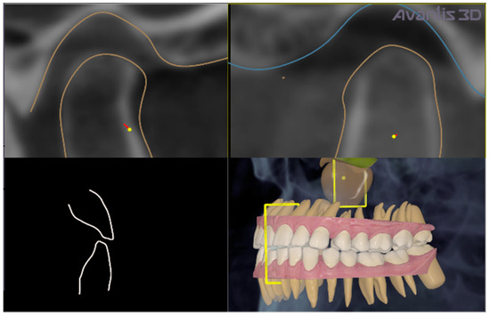 Figure 2c shows the patient’s X-ray. Initially, digital technology was used to construct the “virtual patient”. Intraoral scan and CBCT reconstruction of facial area was obtained. The virtual patient was then analysed using Avantis3D software (LLC Avantis3D, Bolshoy Boulevard, 42/1, Off 137/22, Skolkovo. 121205 Moscow, Russia) and a one-stage virtual plan of the whole treatment was obtained. First, occlusal analysis confirmed tooth wear assessment of grade II (enamel and dentin) [15]. Then, the analysis of TMJs evidenced an asymmetry of the intra-articular space width of the right and left joints. There was a slight narrowing of the posterior third of the joint space on the right, while this same indicator was near the lower limit of the normal range on the left side [6,11,16,17], as represented in Figure 3.