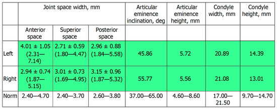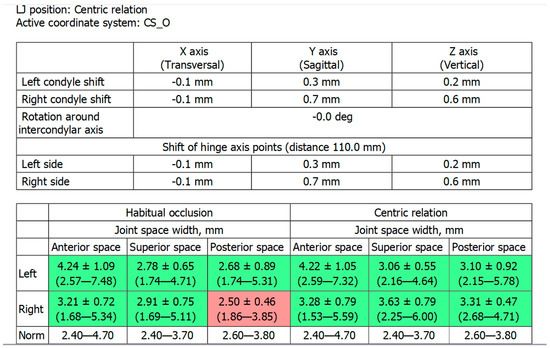Table showed by the software. TMJ analysis after dental treatment, with normal intra-articular space widths both in the left and right TMJ.