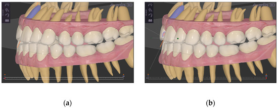 Regarding the phase of orthodontic planning, the present system allowed using the teeth position achieved after condylar repositioning (Figure 5) as the initial position for digital planning of orthodontics (Figure 7a). Conventionally, the planning of orthodontic treatment in patients previously treated with oral appliances for the temporomandibular joint disease involves using temporary occlusal composite bite blocks necessary to increase the vertical dimension to allow teeth extrusion [19]. However, the present system has overcome this necessity, allowing a complete one-stage digital planning.