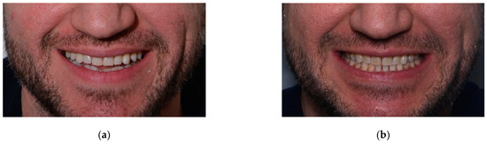 Intra-oral smile view before (a) and after (b) teeth alignment.