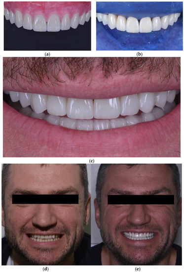 Ceramic restorations fixed on the teeth (a–c); smile view before (d) and after (e) treatment.