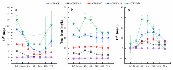 - Zhang, Y.; Liu, X.L.; Fu, C.Y.; Li, X.H.; Yan, B.X.; Shi, T.H. Effect of Fe2+ addition on chemical oxygen demand and nitrogen removal in horizontal subsurface flow constructed wetlands. Chemosphere 2019, 220, 259–265. [Google Scholar] [CrossRef]
