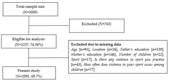Thus, among the total and eligible sample (N = 3000), 763 were excluded because they did not deliver the written informed consent. Furthermore, among the participants who accepted written informed consent (N = 2237; 74.56%), data from 146 participants were excluded due to missing data at least one variable of age, location, father’s education, mother’s education, number of children, sport, is there any violence in the sport you practice, and how often does violence in your sport occur among children.