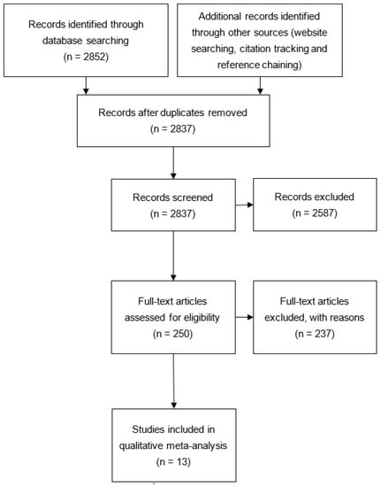 The database search yielded a total of 2853 studies, of which 16 duplicates were removed. After title/abstract screening, 2587 studies were excluded. Full text screening for the remaining 250 studies resulted in 13 included studies (Figure 1).