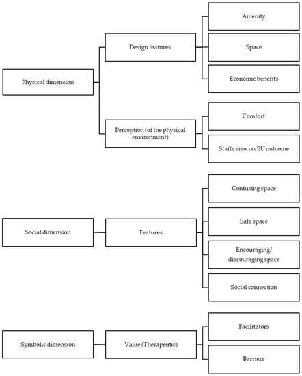 Curtis et al. [28] identified six relevant TL dimensions, namely “Respect and empowerment for people with mental illness”, “Security an surveillance vs. freedom and openness”, “Territoriality, privacy, refuge, and social interactions”, “Homeliness and contact with nature”, “Places for expression and reaffirmation of identity, autonomy and SUs choice”, and “Integration into sustainable communities”, amongst different groups of people related to an inpatient MH facility (cf. 591). These dimensions include: (1) respect for and empowerment of people with mental illness and the extent to which the environment in a MH facility respects the personality, preferences, culture, and religion of SUs; (2) the conflict between the need to control and restrict SUs and the goal of promoting human needs and individuality; (3) the need within a MH facility for dedicated spaces (e.g., for social interactions) without coming into contact with medical staff; (4) a homely atmosphere and the use of natural elements to promote contact with nature; (5) the need to provide facilities that promote the MH of SUs while respecting individuality and diversity and enabling self-directed living and participation in treatment decisions; and (6) the promotion of (social) reintegration of people with mental illness through good networking of MH care facilities with the community environment [28].