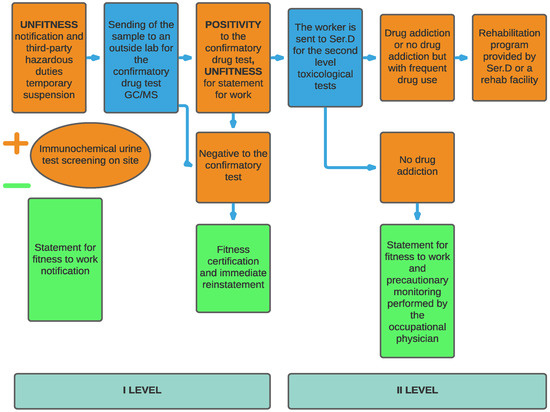According to the legislation in force in Italy, WDT includes two levels of monitoring: a first stage concerning the drug testing of urine samples, and a second involving both urine and hair analysis. The second stage is performed only on workers who test positive at the first level, to distinguish between sporadic, occasional, or continuative drug abuse.