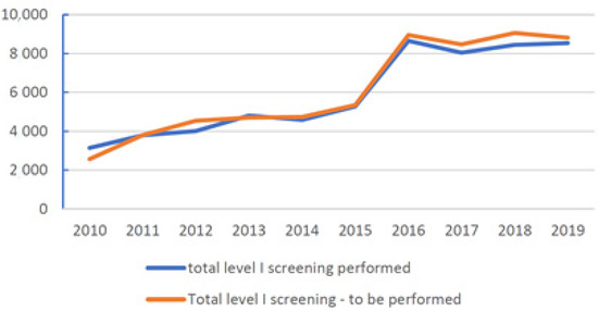 Trend of level 1 screenings carried out from 2010 to 2019.