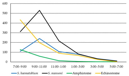 - Théron, A. Early and late shedding patterns of Schistosoma mansoni cercariae: Ecological significance in transmission to human and murine hosts. J. Parasitol. 1984, 70, 652–655. [Google Scholar] [CrossRef] [PubMed]