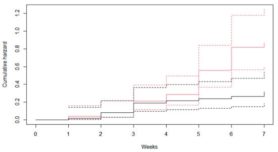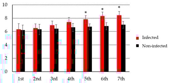 3.2. Comparison of Survival, Fecundity, and Growth between Infected and Non-Infected Snails
