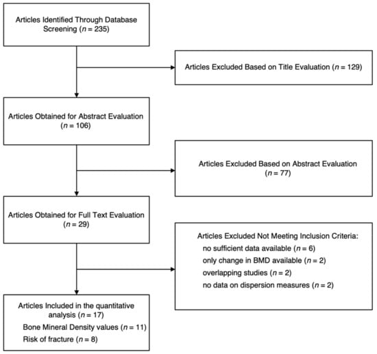 Out of 235 articles resulting from the search, 106 were examined in detail by their abstract, and 29 by their full text. After excluding 12 papers for not meeting the inclusion criteria, the remaining studies (n = 17) were included for the quantitative analyses—11 studies [21,22,23,24,25,26,27,28,29,30,31] providing data on BMD measurements and 8 studies [24,25,32,33,34,35,36,37] providing risk of fracture (Figure 1).
