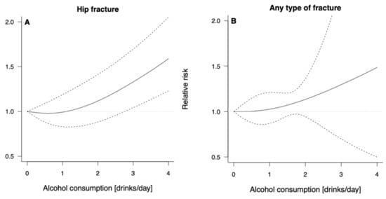 The dose–response association between alcohol consumption and risk of hip and any osteoporotic fractures is graphically presented in Figure 3; numerical data are reported in Table 2. Higher risk of hip fractures was found starting from three standard drinks of alcohol per day (RR = 1.33, 95% CI: 1.04; 1.69 for three alcoholic drinks/d, and RR = 1.59, 95% CI: 1.23; 2.05 for four alcoholic drinks/d) compared to no alcohol consumption, with no evidence of heterogeneity. Concerning the risk of any osteoporotic fractures, the risk steadily increased with higher intake of alcohol, although never reaching statistical significance.
