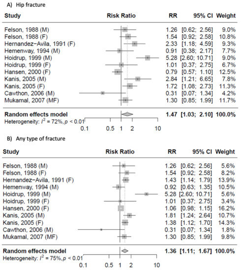 The analysis of risk of fracture when comparing extreme categories of alcohol consumption is presented in Figure 4; both analyses showed an increased risk of hip fracture (RR = 1.47, 95% CI: 1.03, 2.10) and any osteoporotic fractures (RR = 1.36, 95% CI: 1.11, 1.67), with evidence of heterogeneity (I2 = 72%, p < 0.01 and I2 = 75%, p < 0.01, respectively) and no evidence of publication bias (p = 0.464 and p = 0.177; Figure S2). The subgroup analysis by sex showed no differences between men and women for hip fractures, but a significant increase in the risk of any fractures only in women (Figure S3). The subgroup analysis by geographical region revealed that the association between high alcohol consumption and risk of hip and any fractures was significant in studies conducted outside the US (Figure S4); however, lack of significance among US samples depended on the results of one study, after the exclusion of which the risk estimates were significant.