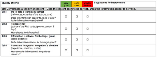 Different materials (e.g., leaflets or posters) are utilized for different activities and purposes in the healthcare system [11]. High-quality PIM should target two objectives: (1) end-user friendly information transmission and (2) a recommendation for action [7]. PIM should be in a readable and motivational style (e.g., use of positive language) and is considered as most effective if it is perceived as being user-friendly [12,13]. Four PIM quality criteria are considered essential: (1) the correctness and validity of content, (2) the readability in respect to text structure and graphic, (3) the comprehensibility for the end-users, and (4) their utility in the field [7,8,14]. International and national checklists, such as Discern´ [15] or TEMPtEd [16], aim to support the design and optimization of PIM and its quality assessment [8]. One already existing checklist, the PEMAT [13], helps professionals in assessing PIM´s understandability and actionability. Unfortunately, the available assessment instruments were developed with, and for, experts and researchers, whereas end-users (patients) were rarely engaged. Moreover, most instruments appear to be unsuitable for end-users’ application, due to the required literacy level. Consequently, end-users are hardly involved in PIM assessment [4,17,18].