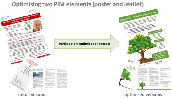 The design process of the new PIM was achieved in a co-creative manner (participation degree five, co-learning), as all PIM optimization team members shared their knowledge and experiences for this purpose [35]. Moreover, cancer survivors and isPO service providers also contributed as co-researchers. We designed two new components: the poster and a one-pager (see Table 4).